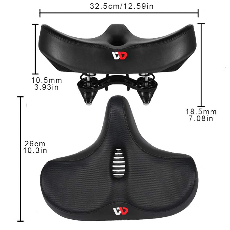 Selle de vélo ultra-large avec rembourrage et amortisseur pour un confort absolu. Parfaite pour soulager les douleurs liées à la prostate, aux hémorroïdes, à la sciatique, au dos (discopathie, hernie discale) et idéale pour les personnes en surpoids.